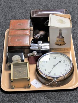 A circular oak Smiths wall clock together with hip flasks, leather cased bridge set, Bells Scotch Whisky decanter, carriage clock etc