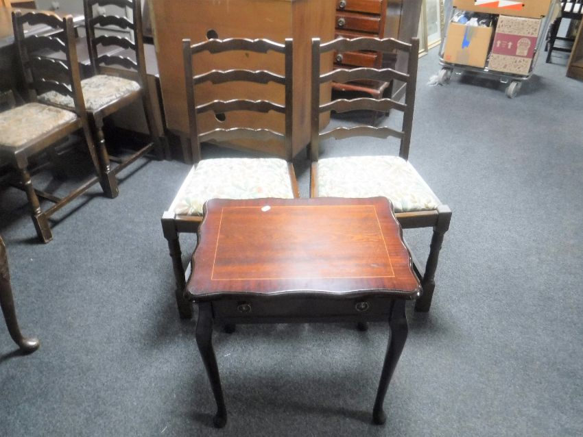 A pair of oak ladder back dining chairs together with an inlaid mahogany occasional table fitted a drawer