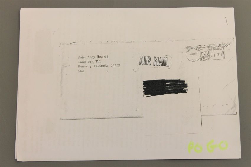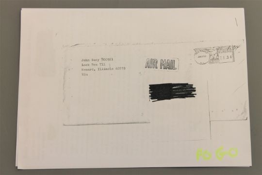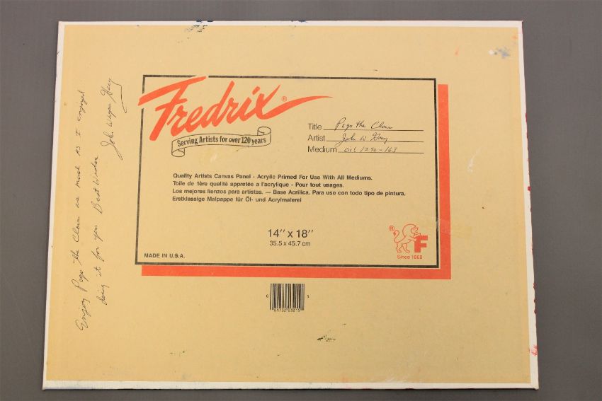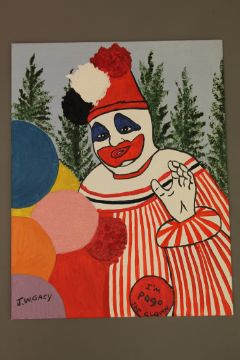 John Wayne Gacy (1942-1994) : Pogo The Clown, oil on board, signed lower left, 35.5 cm x 45.5 cm, inscribed in black biro verso, 'Enjoy Pogo the clown as much as I enjoyed doing it for you, Best Wishes John Wayne Gacy. With outer clear cellophane sleeve with ink printed label 'SCF, IL 622, 64132 592, Mr John Gacy N00921, Lock Box 711, Menard, IL 62259. The picture comes together with a photocopied letter (original has been seen) signed by John Gacy referring to the picture of Pogo numbered '163', with also a copy of the envelope the letter was dispatched in which was dated 'Menard Jan 20 93 Ill'. To view this lot in person please consult the auctioneer.