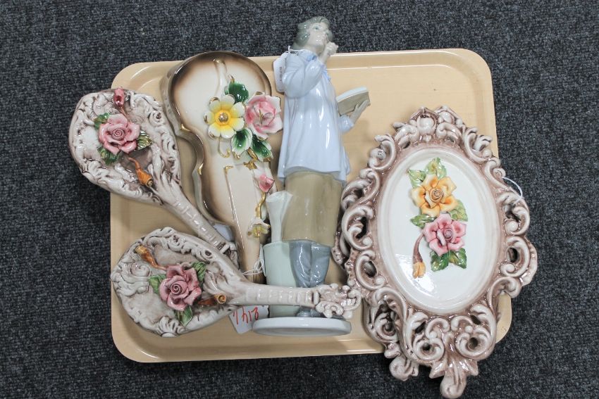 A Lladro figurine : Teacher Woman (a/f), model 5048, height 38 cm, together with a pair of Capo Di Monte ceramic oval-shaped rose wall plaques, height 32 cm, and a pair of "Mandolin" wall plaques and a "Cello" posy holder. (6)