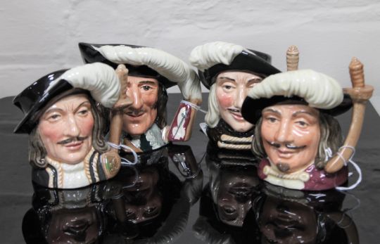 A set of four Royal Doulton character jugs : Aramis, D 6454, height 10 cm, Porthos, D 6453, height 11 cm, Athos, D 6439, height 10 cm, and D'Artagnan, D 6764, height 10 cm. (4)