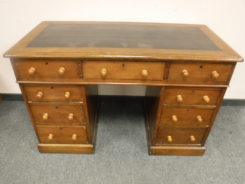 A Victorian oak pedestal desk fitted with nine drawers, width 121 cm.