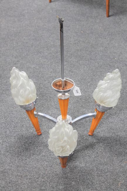 An Art Deco chrome three way light fitting with flame shades