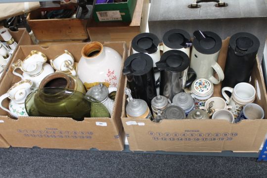 Two boxes containing china water jugs, continental vases, lidded beer steins etc