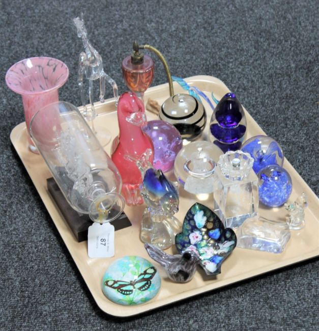 A tray of assorted glass ware including paperweights, animals, perfume bottle, ship in bottle of the Cutty Sark etc