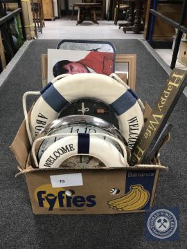 A box of NUFC team photo and signed picture, picture of St Mary's Island, Elvis wall canvases, West Clox wall clock, two life rings