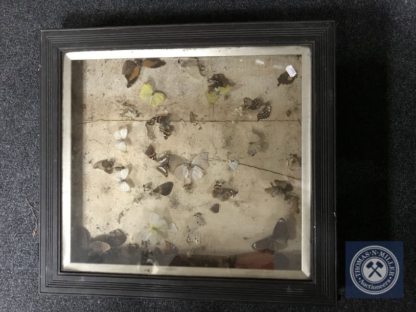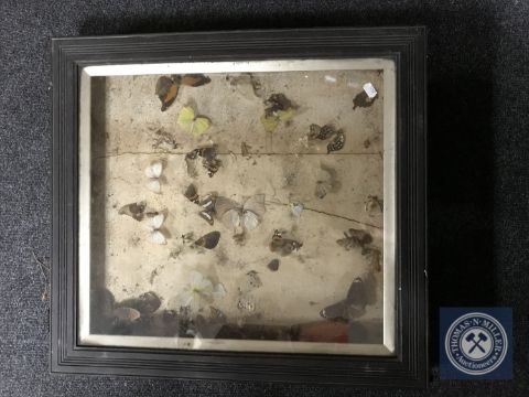 An early 20th century display case containing butterfly samples