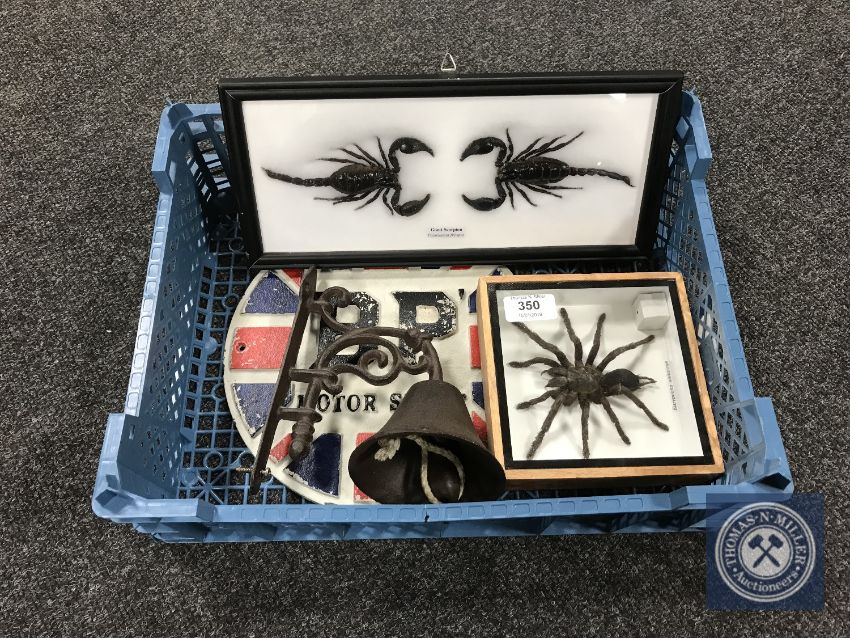 A basket of cast iron BP Motor Sport plaque, cast iron bell, two display frames containing two giant scorpions and a tarantula