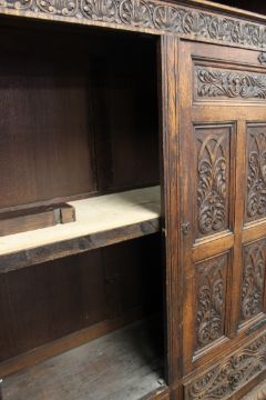 Large split to right side as well as section of moulded skirt missing (but is present). Right door locked with no key. Interior with makeshift plywood shelf. Otherwise generally very good condition.