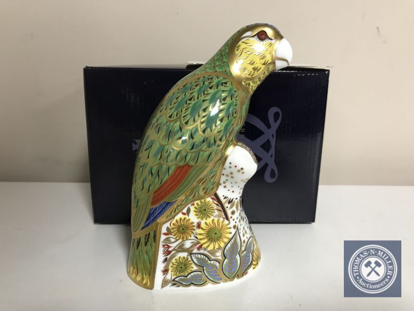 A Royal Crown Derby paperweight, Amazon Green Parrot, with gold stopper, number 1376 of 2500, boxed with certificate.