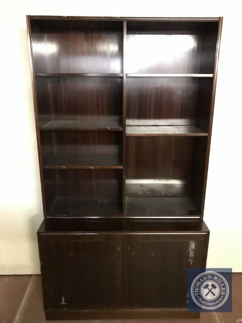 A mahogany open bookcase fitted with double cupboard beneath