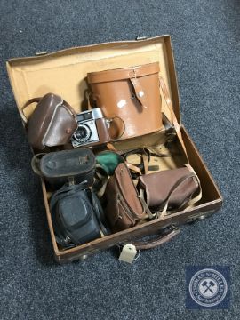 A vintage leather luggage case containing a set of Regent 10 x 50 binoculars, antique leather bound field glasses and assorted cameras