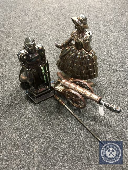 Two Art Deco fire companions, knight and lady, and a cannon fireplace stand with poker
