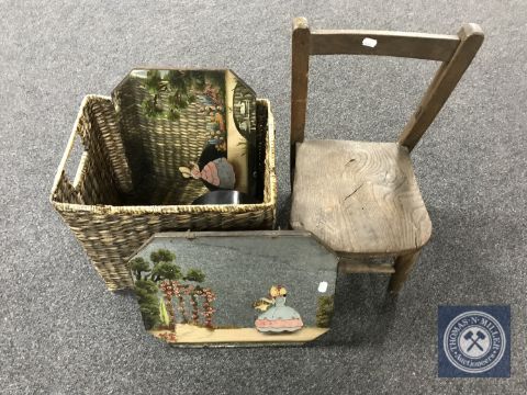 An antique child's chair, wicker basket of oriental lacquered box, two hand painted mirrors