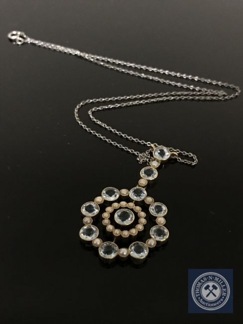 Pendant stamped 18. Upon a white metal chain.