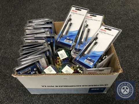 A box of new pens and retractable pencils