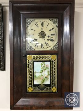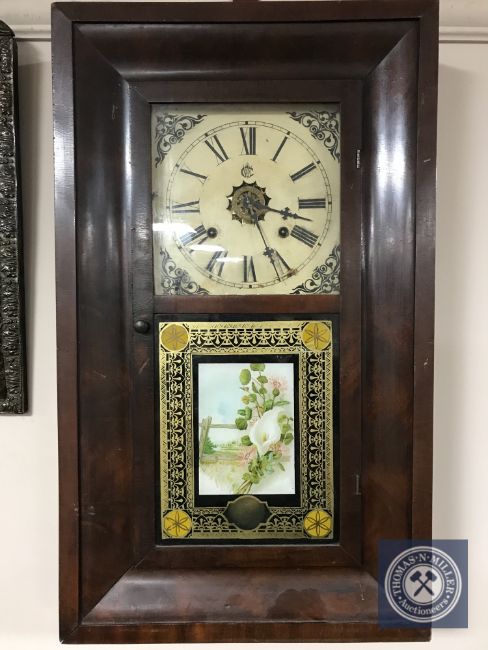 An early 20th century American cased wall clock with pendulum and weights