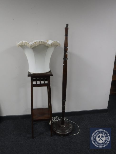An early twentieth century mahogany plant stand together with standard lamp and shade