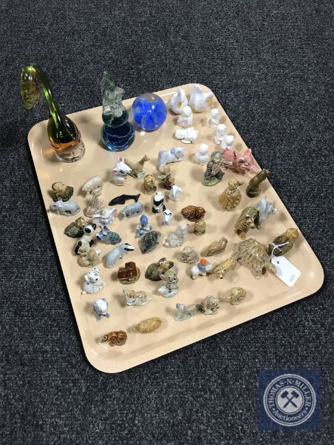 A tray of Wade whimsies, Movites cherub and animal figures, three pieces of glass ware including Caithness Sea Gem paperweight