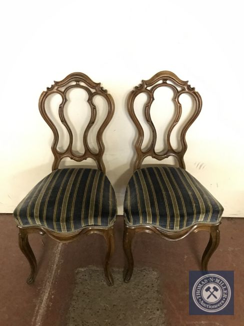 A pair of French walnut dining chairs in striped fabric