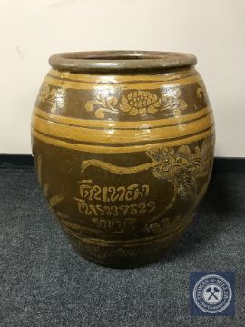A large glazed earthenware barrel planter