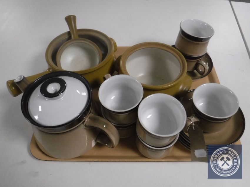 A tray of Denby stoneware coffee cans, cooking pots etc