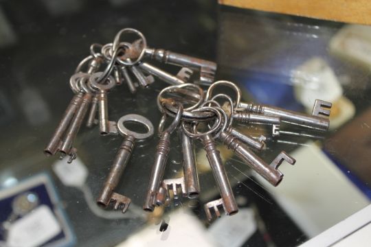 A basket of twentieth century desk calendar, wooden box of keys, cased dominoes, compact, purse etc