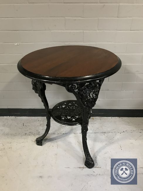 A circular Britannia pub table on cast iron base