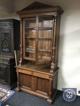 A 19th century oak glazed bookcase with pillar support fitted with cupboard doors