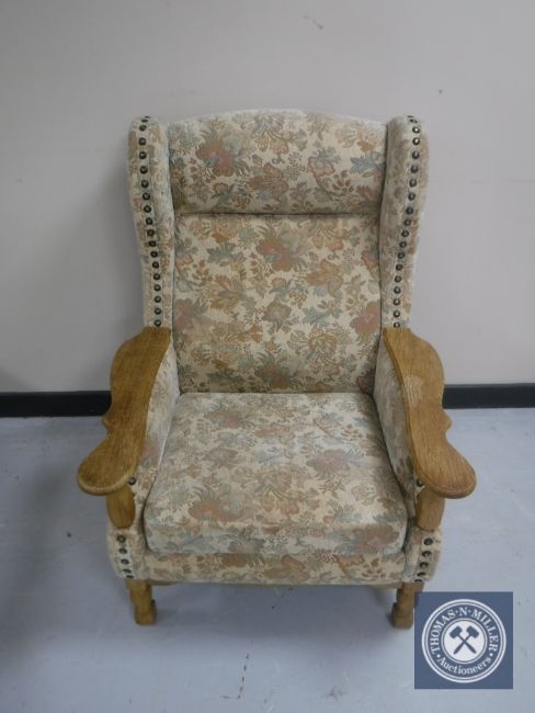 A blonde oak framed wing backed chair upholstered in floral fabric