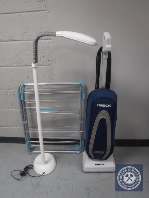 An Oreck upright vacuum, clothes airer and an angle poised reading lamp