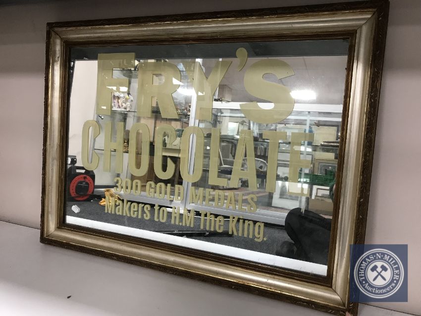 A gilt and silvered framed mirror bearing Fry's Chocolate advertisement
