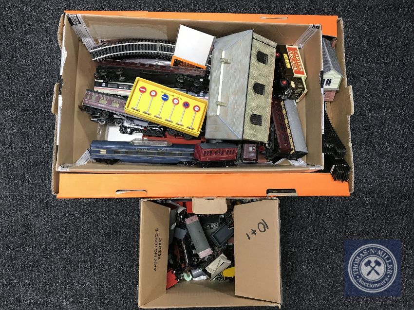 Two boxes of assorted Hornby rolling stock, track and accessories