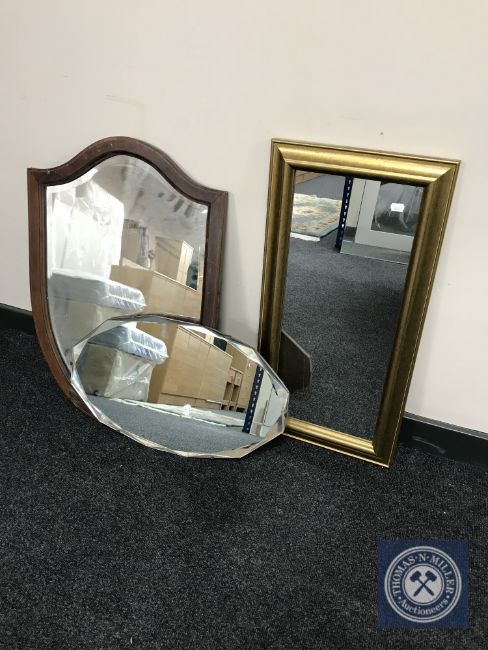 An inlaid mahogany shield-shape mirror together with a frameless bevelled edge mirror and a gilt framed mirror