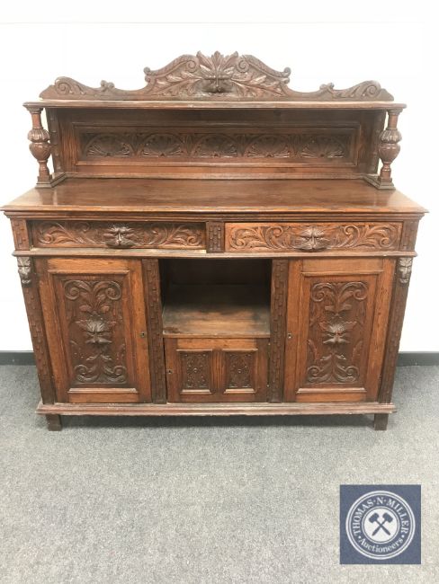 A Victorian carved oak Green Man sideboard, width 150 cm