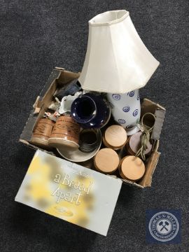A box of Staffordshire dogs, Hornsea storage jars, table lamp with shade, Burslem vase (a/f)
