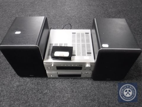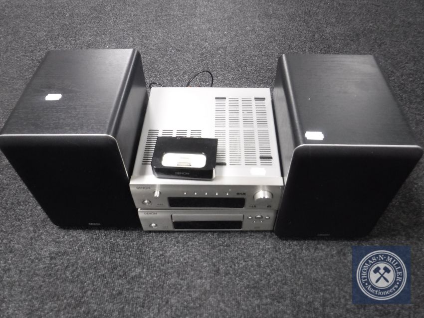 A Denon two-piece separates system with iPod dock and speakers, together with basket containing leads and instruction books