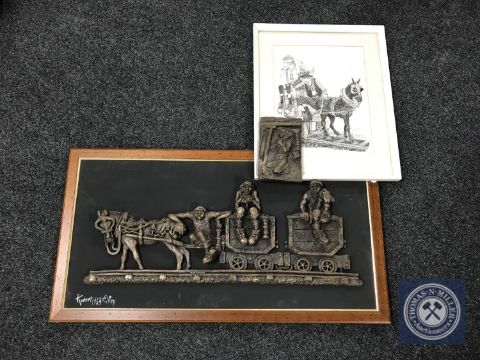 A framed and signed Robert Ollie relief plaque of Miners on a cart, small Robert Ollie relief plaque of a miner at the coal face and a framed Robert Ollie print