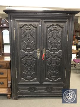 An Oriental style carved and ebonised double door cabinet