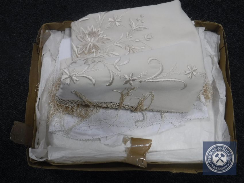A box containing an early 20th century Christening gown together with a hand-embroidered table cloth