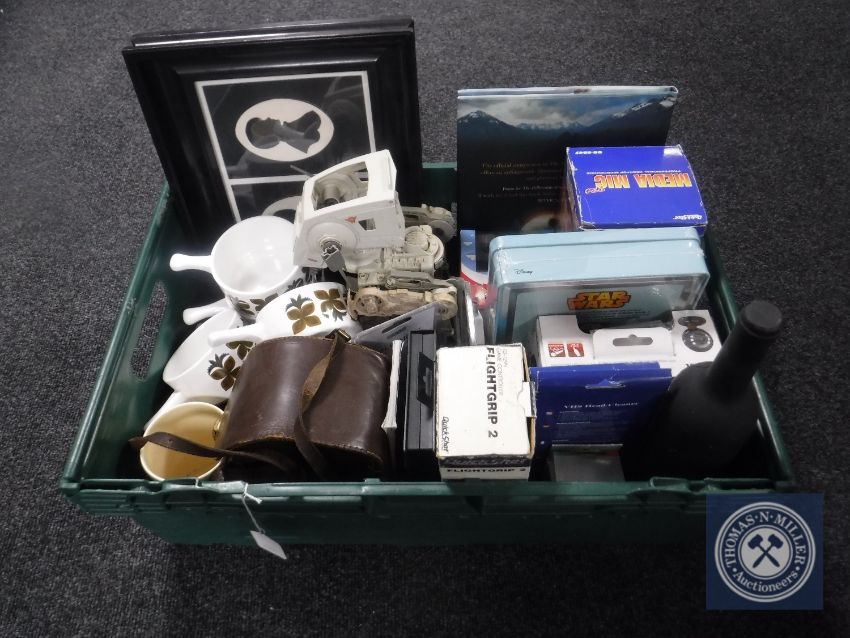A basket of miscellany including a Star Wars AT walker, framed silhouettes, computer web cam, Sega Megadrive game etc