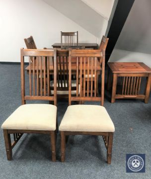 An oak nine piece dining room suite; extending table with leaf, six chairs, side table and a lamp table