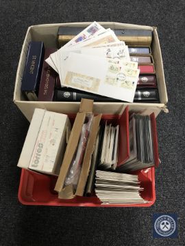 Two boxes of assorted stamp albums and stamps, first day covers etc