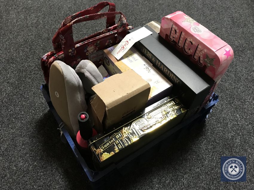 A basket of toiletries, beauty products, hair brush, Cath Kidston bag, storage caddy, wicker basket and a picture frame