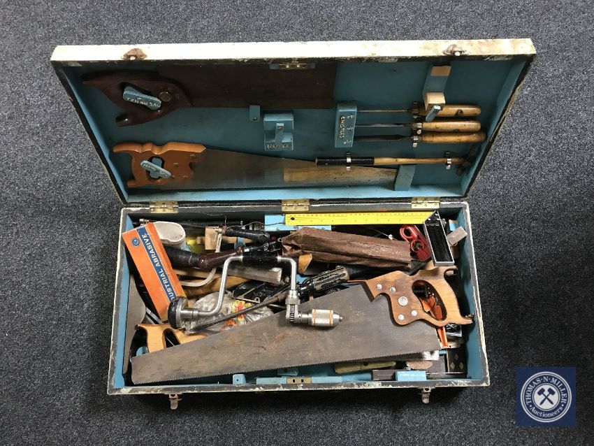 A joiner's tool box of hand tools