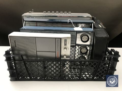 A basket of four assorted radios to include; General Electric Co. transistor 18 radio, vintage Sanyo Campanetta etc, together with a Philips cassette recorder