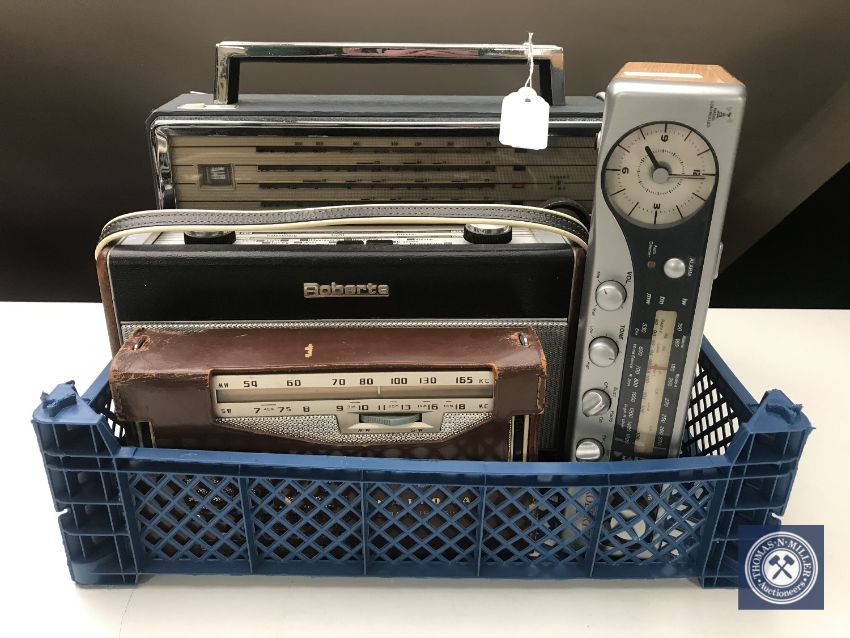 A basket containing four radios to include; National Panasonic portable transistor, Roberts R404, Roberts digital radio etc