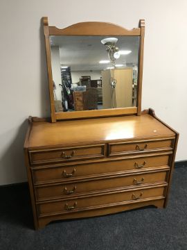 A five-piece bedroom set in teak finish (five drawer dressing chest, eight drawer chest, pair of bedside chests and a bed end)