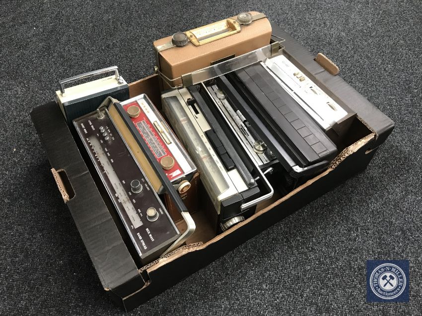 A box containing eight early transistor radios