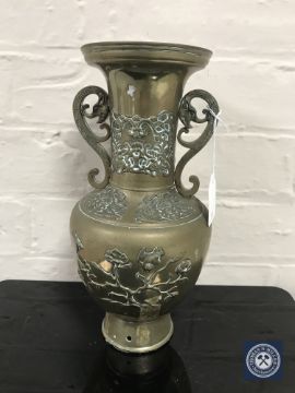 A 20th century brass Chinese twin handled embossed vase, height 29cm